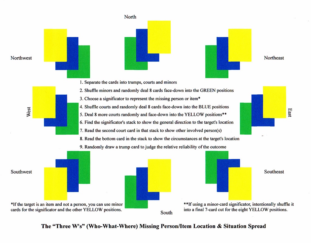 I devised a spread especially for this reading, combining the aspects of location and situation. First, I separated the cards into trump, court and minor card piles, allowing for reversals. I then shuffled the minor cards and dealt eight of them face-down into a wheel arrangement similar to a compass rosette; these were designed to show the situation at the compass point eventually identified by the next step. In this layout, North is at the top, South is at the bottom, East is to the right and West is to the left.