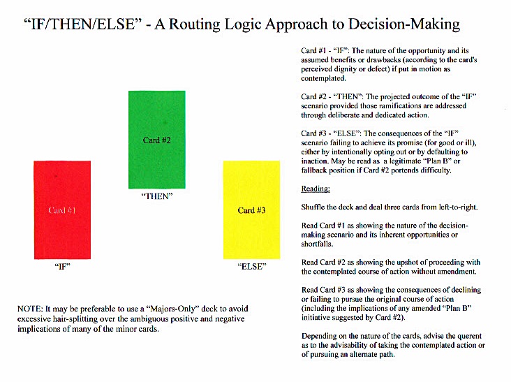 In my last essay I discussed the virtues of the three-card tarot spread as the minimum effective layout for divining any substantive issue (personally, I prefer five cards). I mentioned the typical “past/present/future” line spread and the Hegelian “thesis/antithesis/synthesis” array, but the one that piqued my interest is an approach that uses the data-routing logic of the computer programmer: the “if/then/else” routine for coding a data string that assumes “if” a specific binary condition exists, “then” a particular event will logically follow it, “else” some other event (or no event) will replace it. This seemed like a perfect model for designing a simple decision-making spread with a branching structure. So here it is. I made a conscious effort to deal with the possibility of a “bad” card appearing in the “IF” scenario, such that it may be best for the contemplated action to fail in its promise, opening the way for a “Plan B” initiative. Obviously, knowing this potential in advance, a querent could be advised to consider cutting right to the chase.