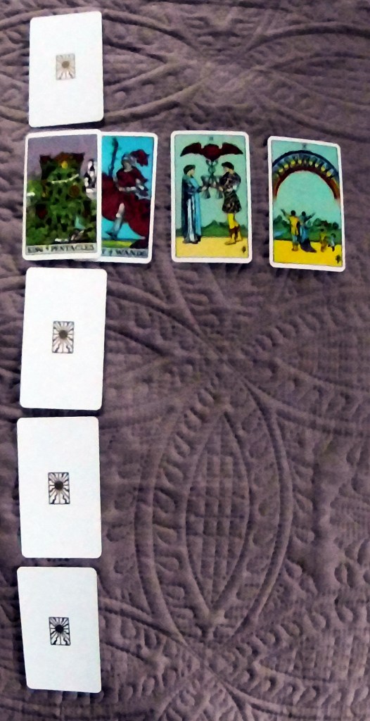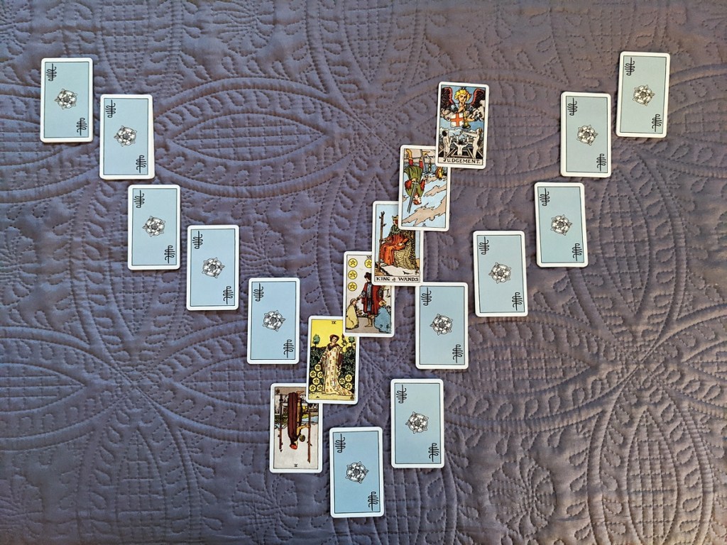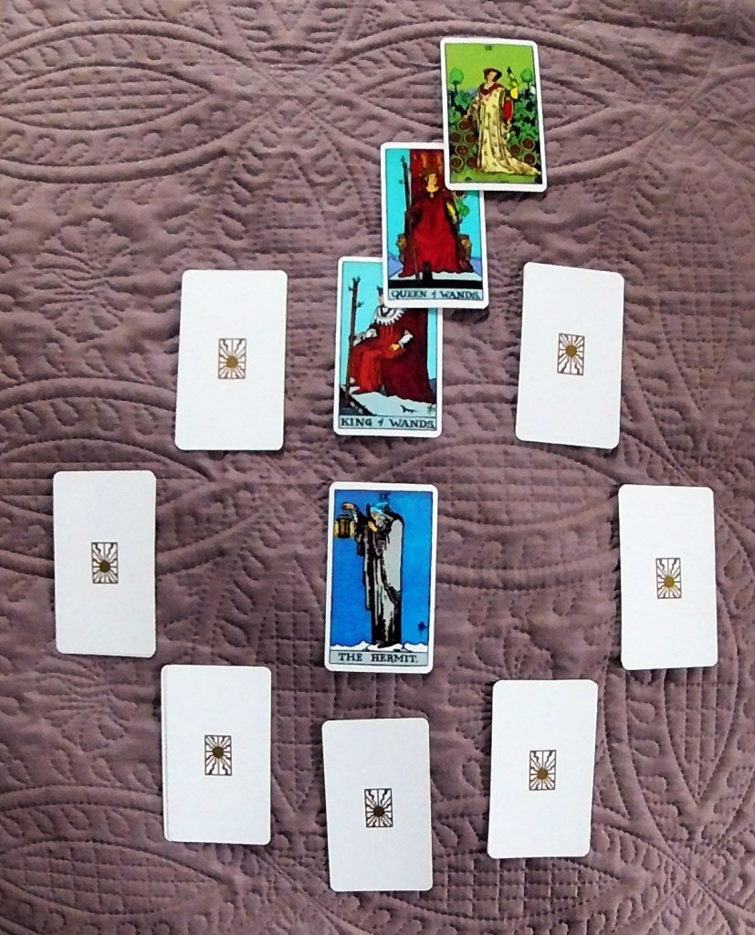Interestingly, I had to perform this reading twice; the first time I failed to follow my own rules, but when I re-did the layout, the significator landed in the same position as it did the first time, just with more supporting detail. This tells me that the array is unquestionably valid.