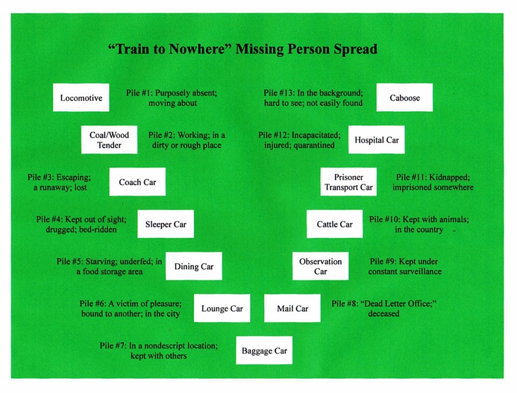 The last spread I applied was the “granddaddy” of my missing-person layouts, the “Train to Nowhere” Missing Person Spread, first used successfully to determine the fate of a young woman from Yuba City, CA. It’s purpose is not to depict the compass direction highlighting the individual’s location, but their status and possible reasons for their absence. This spread uses an antique railroad motif with thirteen compartments (utilizing all 78 cards in the deck), each representing a possible state of being at the time of the reading. Where the significator card lands determines the most likely scenario.
