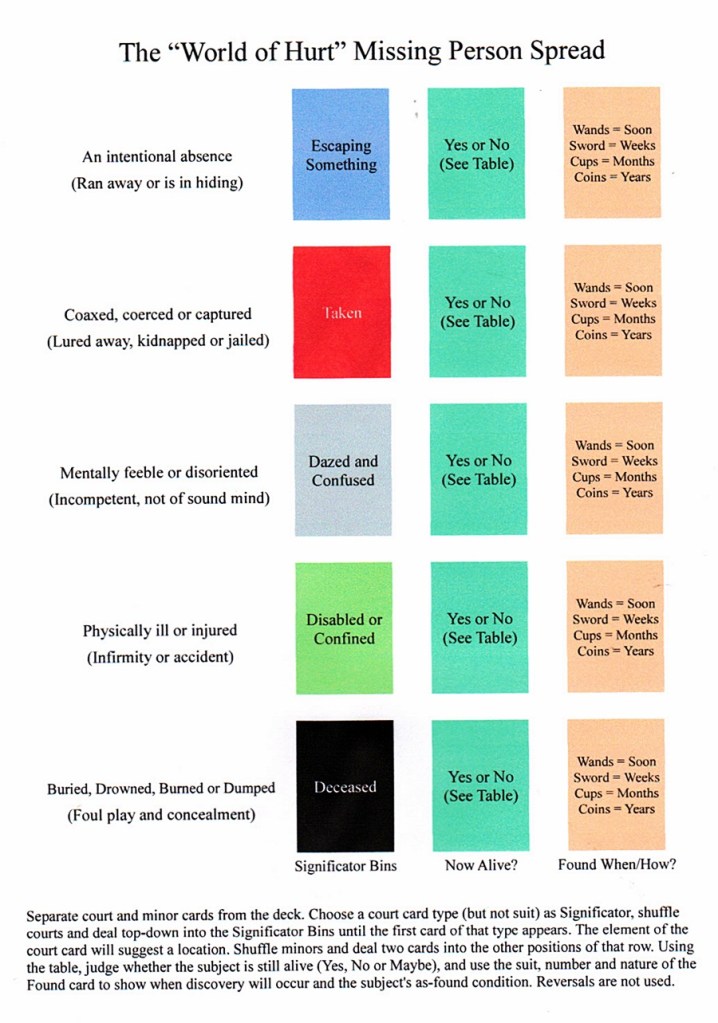 The third spread I applied was the “World of Hurt” Missing Person Spread, which is based on the premise that the individual is in trouble. The assumptions it makes are few, all stemming from the idea that he or she is under some kind of duress and has disappeared either by their own choice or against their will, and in some cases due to insurmountable mental or physical health factors: they may be escaping something unpleasant (for example, a dysfunctional family situation or bad marriage); they were compelled in some manner (lured away, forcibly kidnapped or perhaps taken into custody by law enforcement); they are mentally incompetent or physically disabled and can’t extricate themselves from their predicament; or they are in fact the victim of foul play. In this layout, the first court card of the correct rank (King in the case of a mature male) that appears in the left column serves as the significator, and is intended to show the present condition of the individual in question; the card in the middle column of the significator’s row provides an opinion on whether the person will be found alive or dead; and the card in the right column of the significator’s row gives an indication as to how long it might be from the date of the reading until the missing person is found. Timing with the tarot is notoriously unreliable, so this data point should not be lent too much credence; at best, it might be reasonable to say “sooner rather than later” or the opposite.