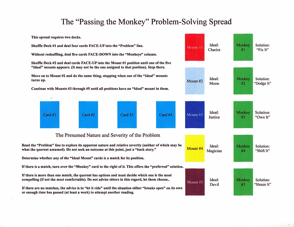 The main challenge was to come up with a convincing way create the “forks in the road” that lead to the preferred solution (or its approximation) in one of the five “Monkey ” cards. This will require two tarot decks: one to populate the “Presumed Nature and Severity of the Problem” line of four cards as well as the “Monkeys” column (proposed solutions), and another from which to derive the five “Mount” (aka “Boss’s Back”) cards that will align with the “Monkeys.” The “Problem” line should be read as a four-part story and not as a timeline; it might show that the situation isn’t as bad as the querent supposed, or that it could be worse. No outcome should be sought at this point since it is just laying the situational “groundwork” for the narrative. The “Mount” card will identify which “Monkey” offers the best option for handling the problem, and they are to be read as a pair for insight into how the solution should be approached.