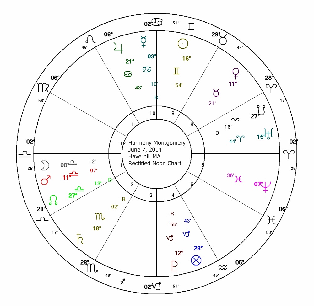I don’t have a valid birth time and exact birthplace for Harmony, so rectification of her horoscope based on limited historical information is the only way forward in examining any transits and progressions of interest in the case. The method of rectification I use involves looking at the unrectified (usually noon) birth chart for personal planets that are in fairly close proximity to one of the angles (preferably by conjunction but other aspects will work), then adjusting the calculation to bring it (or them) into exactness. After that I look for major events in the subject’s life that might be reflected in transits and progressions to the angle involved, after which some further refinement to the math might be necessary. In Harmony’s case we have only a few facts: she disappeared around October of 2019, and she was apparently the victim of parental abuse.