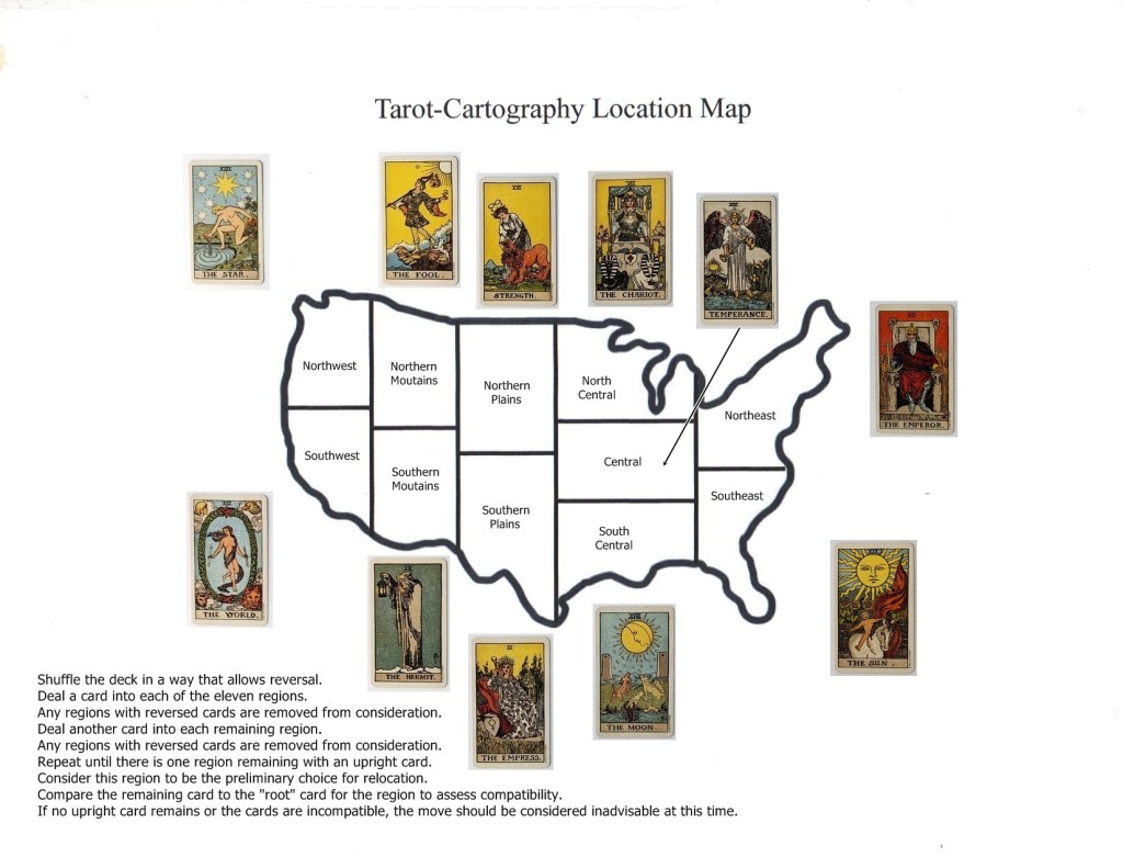 Here’s a little less-complicated fun with reversals. It’s based on the “Astro-Cartography” model from the 1970s. This approach to relocation assumes that we have an urge to move but don’t know exactly where we want to go to find the best “fit.” It uses a process of elimination based on the appearance of reversed cards (think of them as “de-selectors”), followed by a card compatibility determination between the regional “root” card and the final upright one pulled. I tried to pick a root card for each region that made some sense (for example, the Sun for the Southeast US). The divisions don’t follow State boundaries, so exact location will be a matter of judgement, but this will get you in the ballpark.