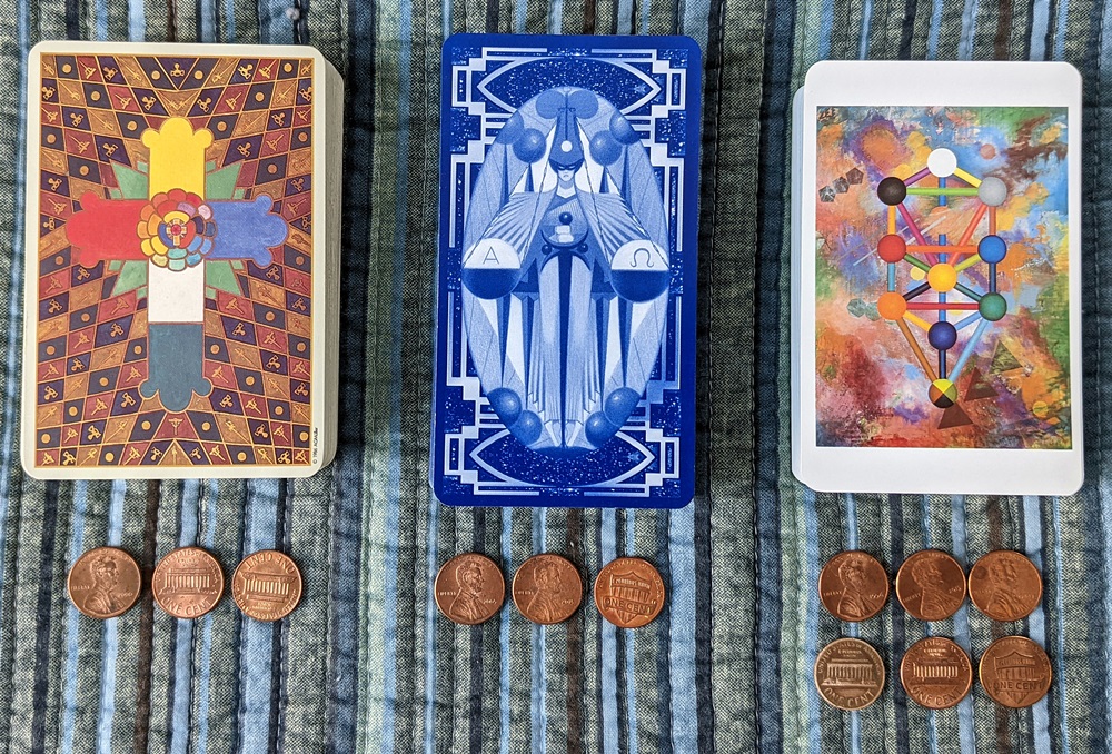 Shuffle the packs and set them side-by-side on the table. Take any three coins (I used pennies as implied in the title), shake them in your hand or in a dice cup and toss them onto the table. (You can also flip them or spin them individually in sets of three although it’s a bit slower.) If you come up with one “head” and two “tails,” draw a card from the deck on the far left and place it in the spread. With two “heads” and one “tail,” pull the card from the middle deck. Three “heads” or three “tails” will show the far-right deck to be the source. Repeat this as many times as necessary to populate all of the positions. If you get a duplicate card, you can either keep pulling for that position or treat it as reinforcement.