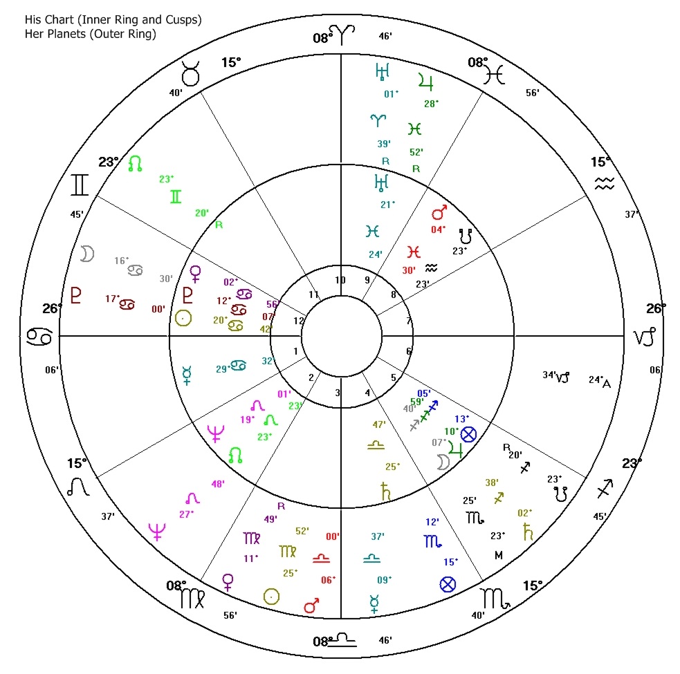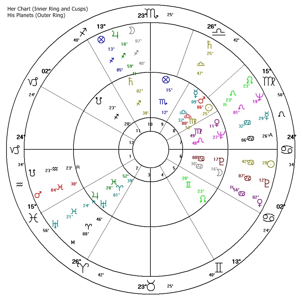 I used this method to rectify my parents’ natal charts. They were a highly compatible pair (she was dominant, he was submissive) so I figured there had to be strong ties between their natal horoscopes beyond the major planetary contacts (Virgo Sun/Cancer Moon for her and Cancer Sun, Mercury and Venus for him). My father was what I might call a very “malleable” person, mild-mannered and unassuming; he tended to take the shape of whatever vessel he found himself in, which suited my mother perfectly. She could be as tough as shoe-leather and as hard as nails, although she had a “soft spot” for his unflagging good humor (most of the time).