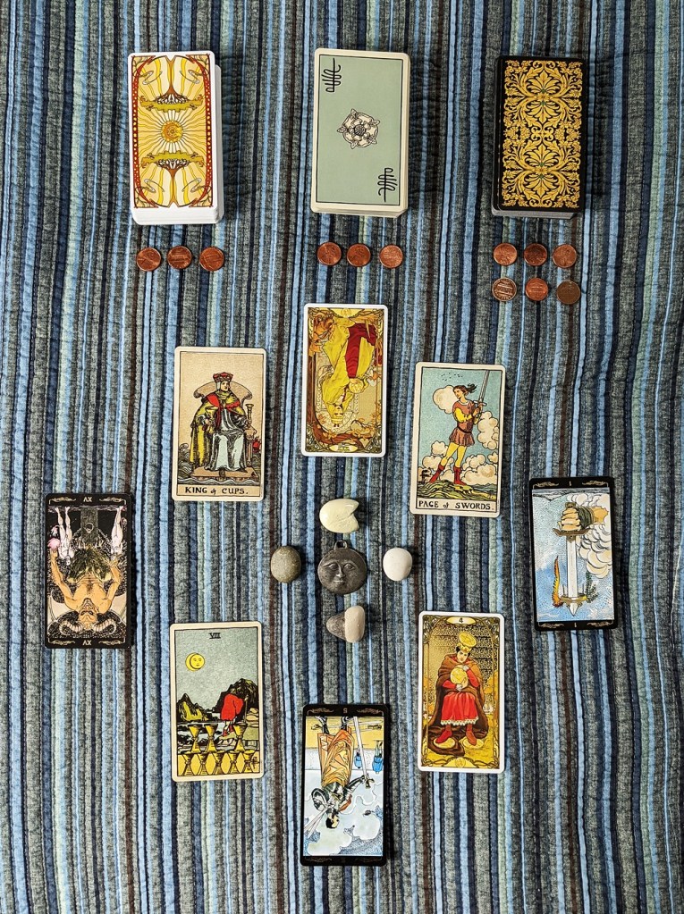 But to be honest, the last two cards may simply mean that I will conserve my resources until the end of the month and then buy that new bottle of scotch I’ve been eyeing (is that King smirking?). A sidelight to this reading is that my “Moon Card” for the month is the Hermit (2+1+2+0+2+2 = 9): with my son and his family quarantined due to Covid exposure, I’ll be drinking alone.