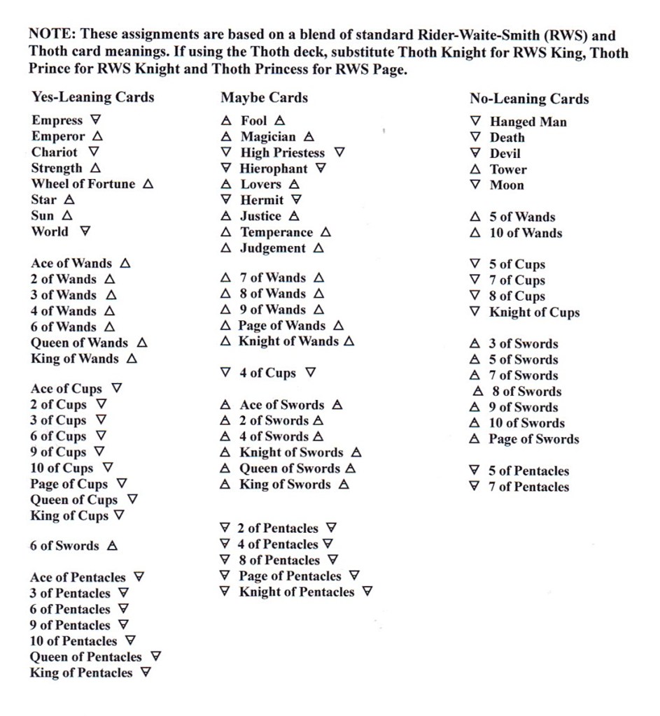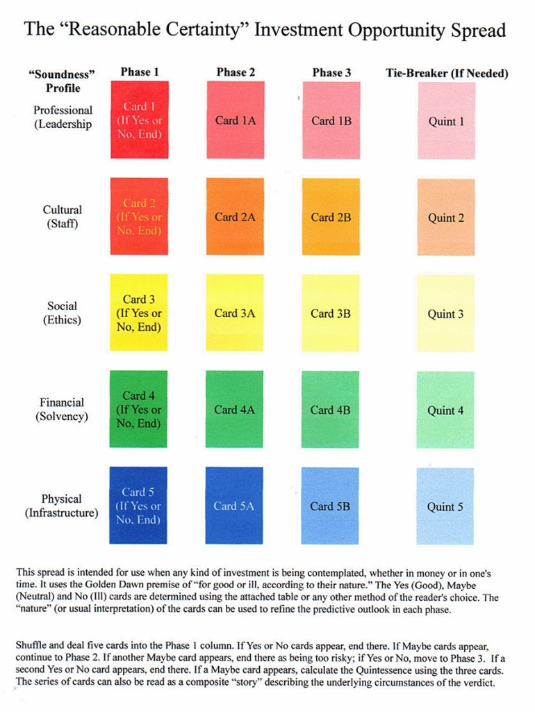 Here is a spread for you “left-brained” types who appreciate a more deductive, methodical approach to tarot reading when warranted. It can be used when the opportunity for any kind of significant investment arises; this can be a financial initiative or any other commitment involving one’s time or resources. Note that if you are of the belief that there are no “good or bad” cards and everything is in a relative state of neutrality until its nature is deduced through intuitive interpretation, this spread won’t work very well for you. However, if you are willing to acknowledge that some cards are more or less encouraging than others, you should be able to make do. The attached table of “Yes-leaning,” “Maybe” and “No-leaning” cards is my own arrangement based on a blend of standard RWS and Thoth meanings, and I have no doubt that you won’t agree with some of them; in that case just use your own experience-based judgment. As you will notice, mine is skewed slightly toward positive and neutral assumptions with the understanding that “bad” seldom means “all bad” in a way that precludes any improvement in fortune.