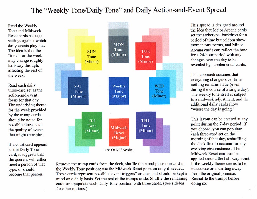 First and foremost, at their best the typical one-card daily draws have always seemed to be nothing more than “tone-of-the-day” indicators showing the steady-state mood or “pitch” that might run through our lives and activities. For me, three has always been the minimum number of cards to reveal where the day might be going because there is an observable opportunity for some kind of change-over-time in them. So in this spread each day is represented by a three-card “mini-tableau.”