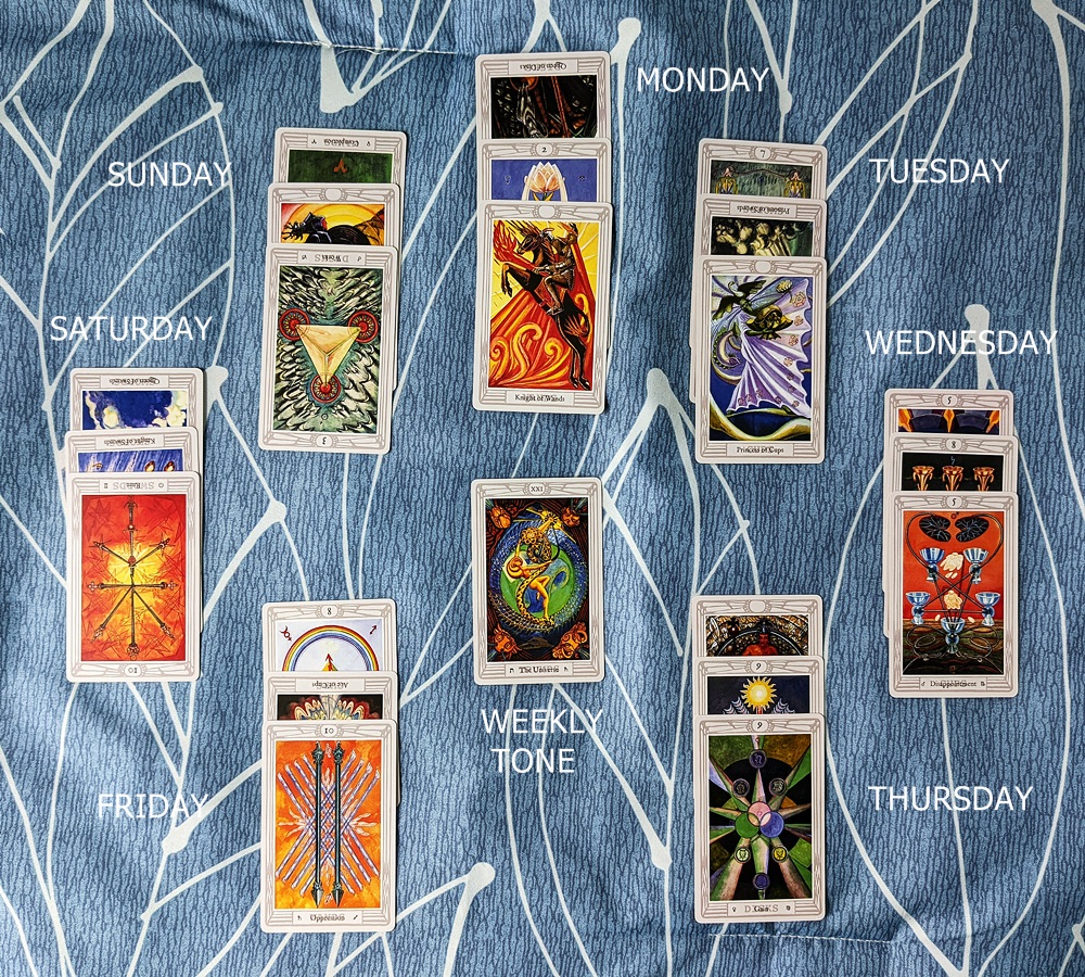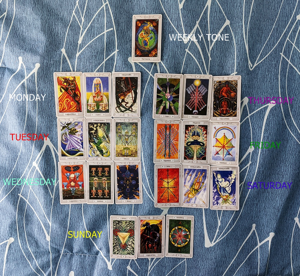To test my new weekly/daily forecast spread, I used my Retro Thoth deck to perform a seven-day reading for the current week beginning Monday, February 21, 2022. I permitted reversals, but in this spread they merely represent a less evident expression of the upright influence. I’m getting good mileage out of the minor and court card titles here. (Note that the gap at the bottom-most Midweek Reset position is intentional at this point and will be populated if the first trump turns out to be of questionable precision by Wednesday or Thursday.)