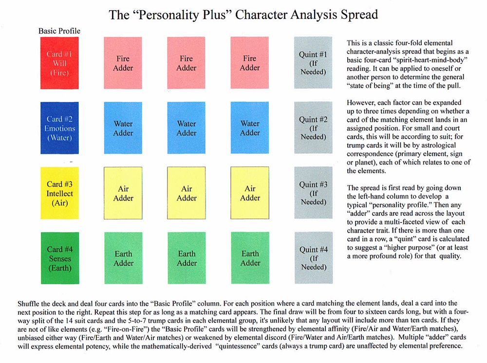Here is a spread that builds on the standard four-factor identity model by allowing for an “unfolding” or “flowering” of the basic personality snapshot into multi-faceted fullness stimulated by elemental interaction between the cards pulled and the underlying “state of being” reflected in each “phase:” Fire and Wands represent the Will (including primary drives, urges and desires of all kinds); Water and Cups describe the emotional life; Air and Swords show the domain of the intellect; and Earth and Pentacles embody the world of physical sensation. For example, an individual who is “super-charged” with four Fire cards might be insufferable, and the only saving grace could be a counter-balancing “quint” card like the High Priestess or the Hierophant.