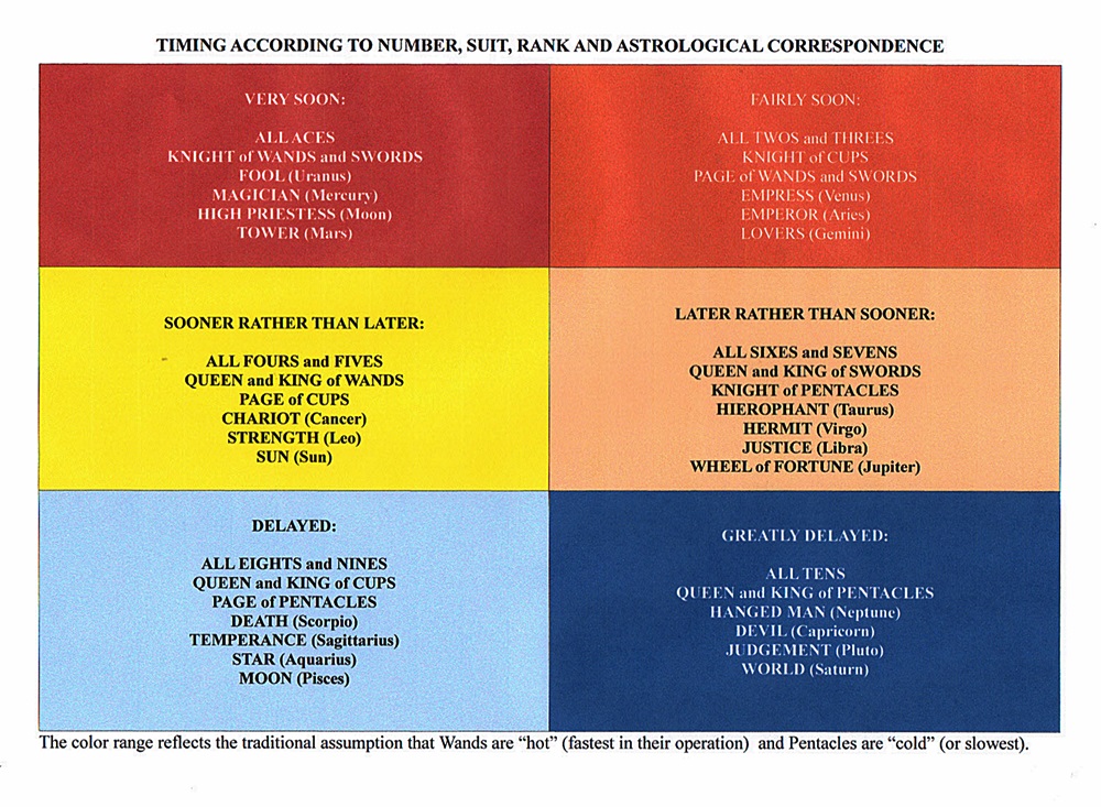 My assumptions are that all of the Aces are prompt and all of the Tens are tardy since the former are the least encumbered of the series and the latter are the most constrained, with the rest of the numbers from Two to Nine falling into intermediate states of increasing delay. These numerical placements are largely free from the usual timing considerations for the suits of the Minor Arcana, with scant credence given to the traditional assumption that Wands are “hot” (categorically “fastest” in their operation) and Pentacles are “cold” (or always slowest to act). For example, in practice I might “nudge” an Ace very slightly in one direction or the other depending on its suit; in that sense each colored portion of the attached table can be seen as a graduated “band” rather than a catch-all “bucket.”