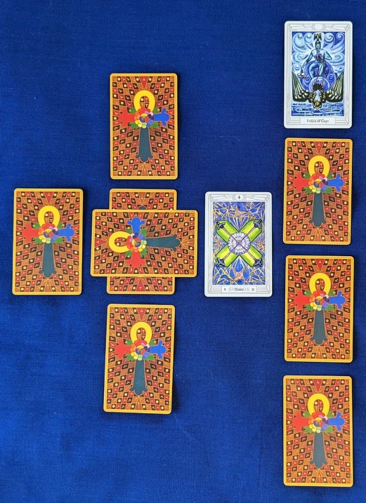 As any tarot reader knows, the venerable Celtic Cross (CC) layout includes two “future” positions: the “Near Future” that is the last card in the “cross” section and the “End of the Matter” (or long-range “Outcome”) card at the top of the “staff” section. Although the general timing assumptions for these forecasts are built into the spread, I’ve always operated under the premise (reinforced by numerous forum conversations) that the “Near Future” would make its appearance within one to four weeks of the draw, and the “Outcome” would follow within one to three months of the completion of the reading, which is the normal limit of reliability for a CC prediction. For me the “Near Future” represents a precursor to (or stage-setter for) the “last word” on the matter, and can be looked to as a prompt or “way-shower” for what is to come and how it might be approached; the three cards between the two serve as “way-points” along the path that can facilitate any needed mid-course correction. (I noticed while reading Tarot Beyond the Basics that Anthony Louis adds the fifth card of the “cross” – which he and I both call the “Present” although I think I beat him to it by a couple of decades – to the “precursor” outlook.)