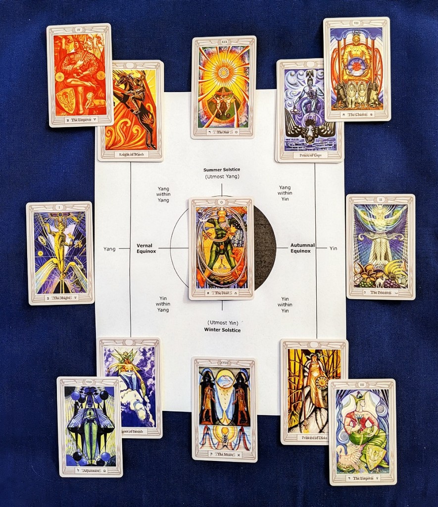 As I continue to explore the Taijii (“Yin/Yang”) symbol in combination with the Major Arcana of the tarot, I downloaded an image and inserted the semi-annual solstices and equinoxes to create a four-season cyclical pattern showing the interplay between the dark of Yin and the light of Yang over the course of a year. I reviewed all of the trump cards with an eye toward which four are the purest expression of the primary energies of Yin and Yang, and which four best fit the blended intermediary qualities (Yin within Yin; Yin within Yang; Yang within Yang; and Yang within Yin). I paid no attention to the zodiacal positions of these cards in the calendar year and just used their Golden Dawn planetary and elemental associations in a freely associative way. Because the seasons are a balanced equation, there are no truly discordant pairs here; any less fortunate implications will come from the cards of a reading that are drawn for the “template” positions.