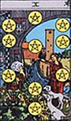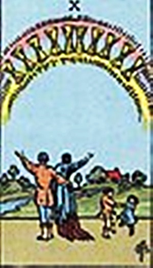 I’ve written in the past that, esoterically speaking, the Tens of the tarot suits represent the exhaustion of the original elemental force that first appeared as pure, untrammeled spiritual energy in the Aces. This is based on the idea that “Spirit” descends into “Matter” by flowing downward on the Tree of Life until it reaches its utmost material expression at the bottom (tenth) sephira. At that point it is fully clothed in Form and has sacrificed its transient fluidity and mobility, becoming firmly grounded in the here-and-now. Although Pythagoras considered Ten to be the “perfect number,” Hermetic Qabalists see it more as a postscript to the state of completion shown in the Nine, an enervated sendoff that presages emergence into the Ace of the next suit in a circular (or spiral) progression. The divinatory meanings for the Tens are a mixed bag, some showing satisfied fulfillment and others extreme duress, but most give the impression of being overdue for a shake-up.
