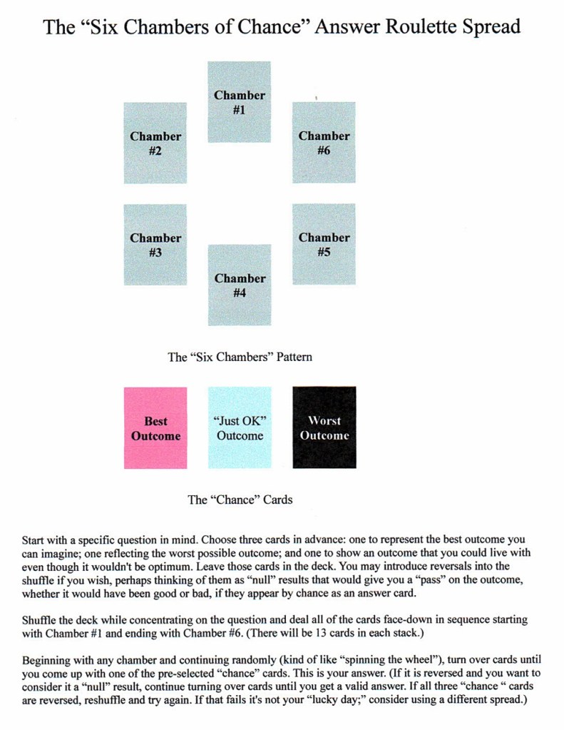 Here is a spread based loosely on the casino game of roulette (with a thinly-veiled allusion to a more threatening form of roulette that may be a superior analogy depending on the seriousness of any potential consequences). It uses a range of three pre-selected “answer” cards and all 78 cards of the deck in the draw (13 cards per stack after the deal). I’m proposing the use of reversals in a creative way to yield “null” results that would take certain cards “off the plate” and permit seeking an alternate answer; specifically, if the “Worst Outcome” card comes up as the answer but it is reversed, you could take a pass on it and find the next “chance” card, either the “Best Outcome” or the “Acceptable Outcome.” The same could be done for the middle “chance” card if it appears reversed and you think you can do better, but then there is a 50% risk that the alternate answer will be worse.