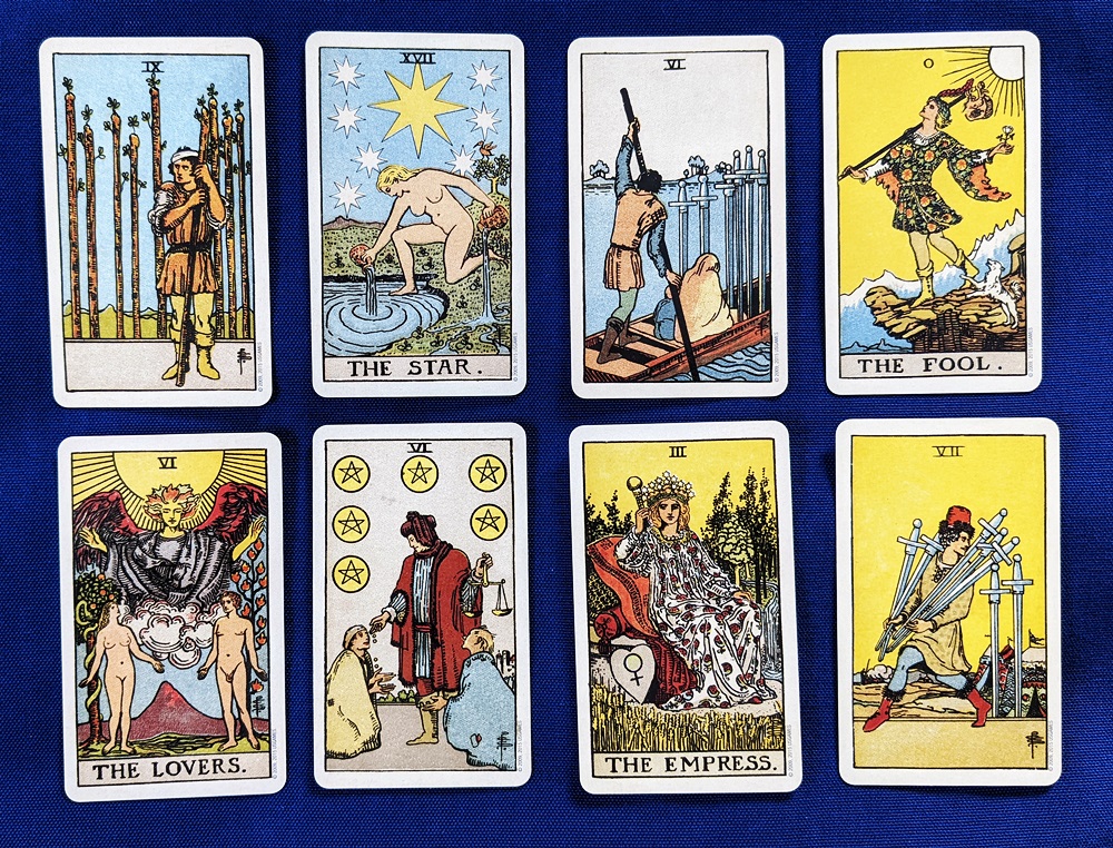 In my last post I did a “retake” of a reading for a game between the Buffalo Bills and the Detroit Lions that will occur sometime during the autumn of 2022. I already discussed the projected scoring track for the two teams but only briefly mentioned the on-field conduct of the game. The cards were very revealing in that regard as far as substantiating the scoring outlook so I wanted to take a few minutes to discuss them. The Bills are represented by the top row of the layout with the Lions in the bottom row. I consider this a “new style” analysis because it uses a “prepared” deck that only includes cards that can produce legitimate scores according to NFL scoring conventions, either by a single number or by addition or multiplication of that number. (By way of example, any “7” – a single touchdown – would double into “14” – two touchdowns in a quarter as reflected by Temperance, or triple into “21” – three touchdowns as expressed by the World; two 7-point touchdowns and a field goal would be reflected in “17,” the Star). For information, here are the quarter-by-quarter scores as they appeared in the reading.