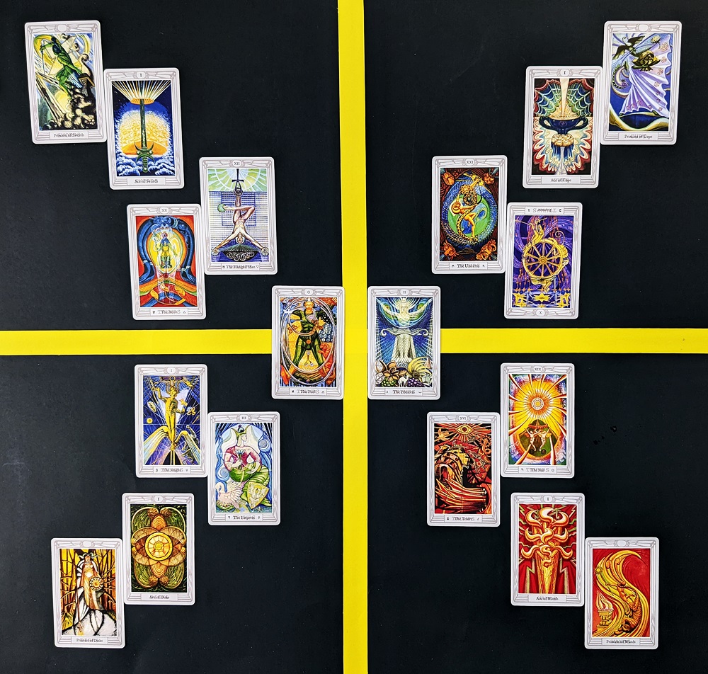 We can pretend that placing the Fool to the east of the celestial meridian and the Priestess to the west equates to the formula 0=2, but Crowley’s intent can be expressed most simply as 0 = (+1) + (-1) so that’s just an intriguing whim. Mercury (the Magus) and Venus (the Empress) are joined with the Ace and Princess of Pentacles in the northeastern quadrant of space; Mars (the Tower) and the Sun with the Ace and Princess of Wands in the northwestern quadrant; Jupiter (the Wheel of Fortune) and Saturn (the World) with the Ace and Princess of Cups in the southwestern quadrant; and the Hanged Man (elemental Water) and the Aeon (elemental Fire) with the Ace and Princess of Swords in the southeastern quadrant.