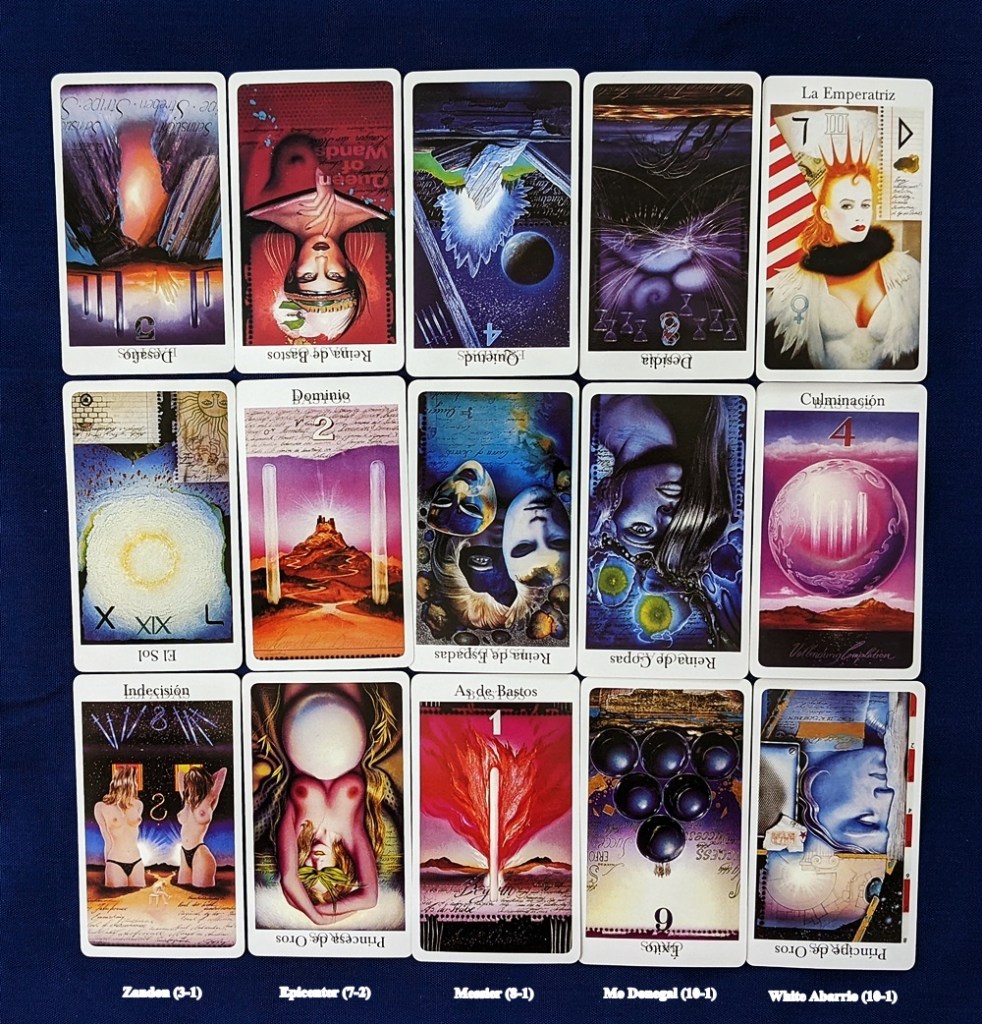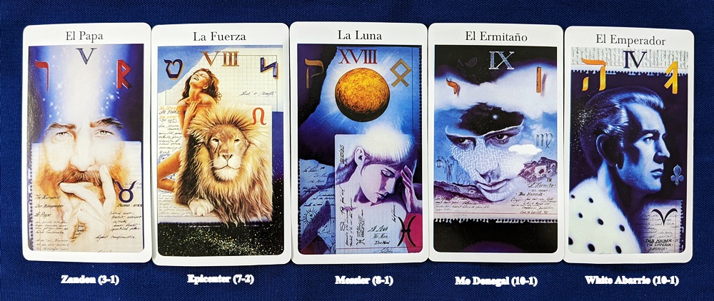 Although I’ve done numerous baseball and football readings in the past, I’ve never tackled horse racing. I have the perfect spread for multiple contenders in the “Test of Truth” Winning Hand layout from my book of spreads, The Literal Tarot (shameless plug: it’s on Lulu). Since the 2022 Kentucky Derby is Saturday, I decided to take a stab at it. For the spread I picked the five horses that had the shortest odds since my understanding is that short odds means they are more likely to win but will pay out less to bettors. In the first column I placed Zandon at 3-1 (as of May 5th); in the second column, Epicenter at 7-2; in the third column, Messier at 8-1; in the fourth column, Mo Donegal at 10-1; and in the fifth column, White Abarrio, also at 10-1. I used the Rohrig Tarot for this reading since it is “glitzy” enough for such a glamorous, high-rolling event.