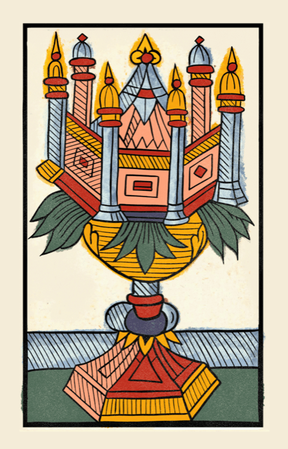 As the “root” of the active unitary principle (One), the Ace of Cups is emotionally detached and sits above the fray. It could be said that it “dispenses” rather than “collects.” As the Prime Mover in every odd-numbered Cup, it is more staunchly directive than responsive to emotional currents, more about focused anticipation than participation.