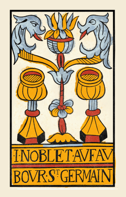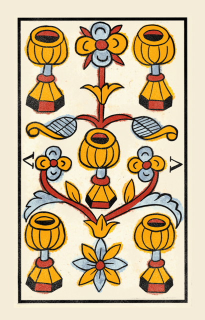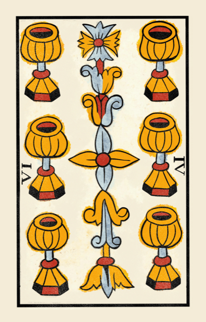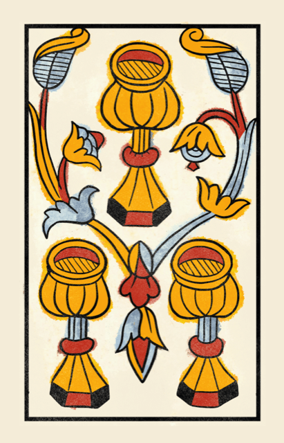 In his 1949 Tarot de Marseille book, Paul Marteau made frequent use of the term “condensing” when discussing the action of the suit of Cups on the emotional “vapors” (my word, not his) of the human psyche. The Cups are obviously vessels for holding liquid, and my fanciful take on Marteau’s idea is that they accumulate the “dew” of residual feeling that precipitates from most personal experiences, whether or not we consciously acknowledge it. That subtle effluvium condenses and concentrates in the process; depending on the nature of the card, it can become either enriched and emotionally nourishing, promoting an innate sense of well-being, or prone to stagnation and corruption, leading to episodes of nagging discontent. The even-numbered cards lean toward harmonious integration, while the odd-numbered cards are more inclined toward turmoil and introduction of destabilizing elements. Here is a “suit-and-number-theory” tableau that examines the progression.