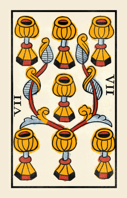 The Seven of Cups “tests the waters” of new feelings. The central chalice is bottled up and must “pop its cork” to taste any freedom of expression. It suggests building pressure in response to the “stuck” complacency of the Six, and in that regard it is similar in scope to the turbulent Five; it senses that there is more to emotional stimulation and satisfaction than staying in one’s “comfort zone.”