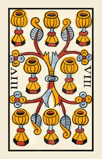 The Eight of Cups capitalizes on the stacked harmonies of the binary series to build a kind of fortress of sanguine insouciance. (Monty Python might have called it “tenaciously frolicking away.”) But all eight of the chalices have egress to embrace new impressions if they tire of the routine. The two sets of four chalices create both stability (the external rectangle) and the impetus for a change of circumstances (the internal diamond). J.E. Cirlot calls one “material and passive” and the other “material and active;” together they spell pragmatic opportunism in the emotional sphere.