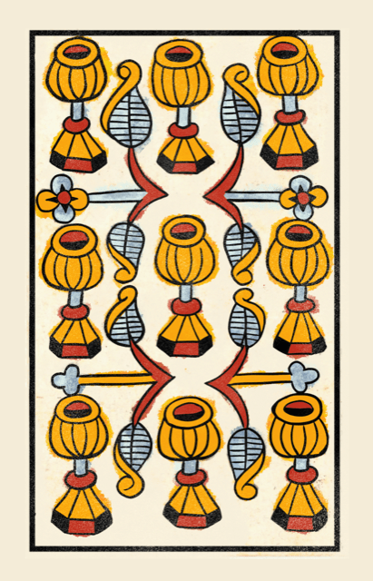 The Nine of Cups admits a ray of motivating disenchantment into the leisurely equanimity of the Eight. It has momentum and a sense of purpose going for it, being both the sum of three ternaries and 3×3. The central chalice is “in the driver’s seat” and radiates its influence in all directions, although its most potent emphasis is on the aspiring vertical rather than on the “flat-lined” horizontal or the unpredictable diagonal.