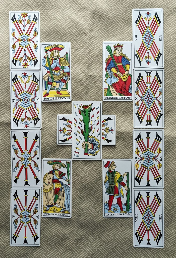 Here I align the seminal “root power” of the Ace and the linear binary projection of the Two with the “agency” of the court cards and the situational “ways and means” symbolized by the remaining pips to produce a developmental tableau that enlivens Tarot de Marseille delineation. Rather than following the esoteric assumption that only the Princesses (Valets or Knaves in the TdM) interact directly with the Aces, I bring all of the court cards to bear on the transition from potential to kinetic expression of the inaugural moment in any projected event. The Ace shows a single-pointed impulse or capacity for launching the action appropriate to its suit and the Two reflects the initial thrust of that force into the world. (Paul Marteau describes the function of the Two as “hatching” and an “inclination to expand,” both of which are perfectly credible.) The rest of the pips conduct its practical import into life’s multifarious circumstances and the court cards act as facilitators to translate and embrace the realization in human terms.