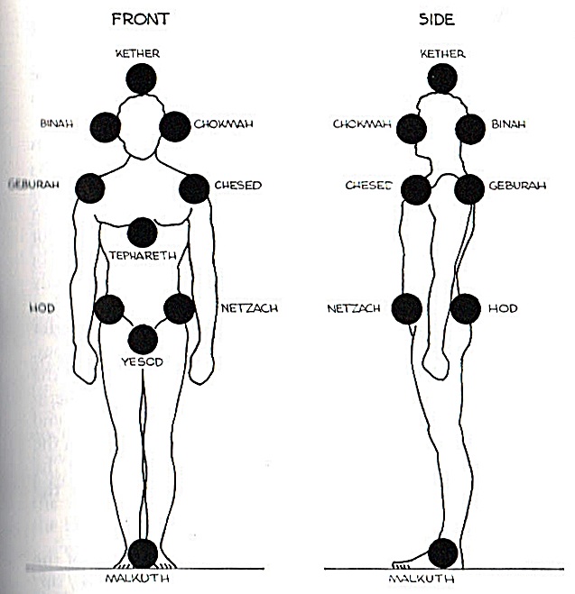 I’m not inclined to take at face value anything theologians 2,000 years ago said God might or might not do, so I think Sturzaker has it right from a more humanistic perspective. In classical military terms, the right arm is the “sword arm” – ideally symbolic of the concept of “severity” – and the left arm is the “shield arm” – more closely aligned with the opposing concept of “mercy” and exemplified by the ideas of protection and preservation. So Adam Kadmon shown looking out from within the Tree is well-situated to dispense the correct measure of justice. I posted previously on this subject in a slightly more anatomical context.