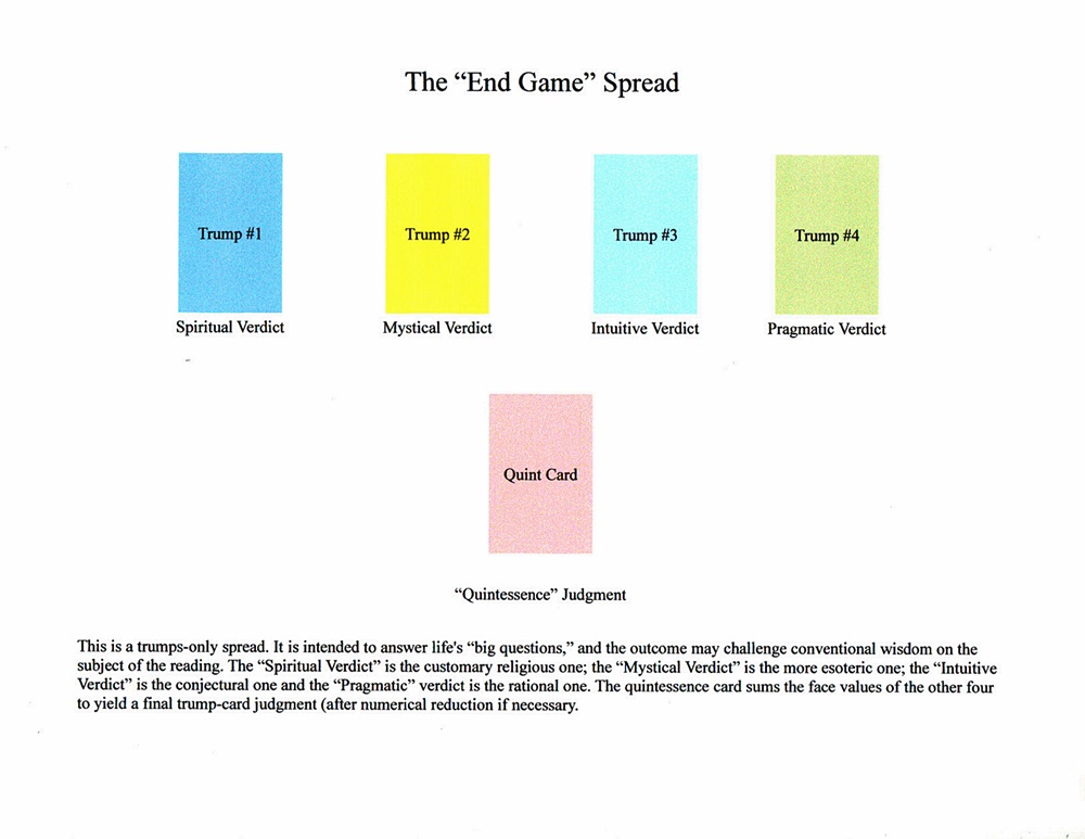 But we could just as readily ask “Will I be happy in this marriage?” I decided to approach such questions from four different angles, Spiritual, Mystical, Intuitive and Pragmatic, with a final “quintessence” or summary card to give a broader perspective on the answer. This spread requires only the 22 Major Arcana cards and I recommend not using reversals. I don’t have time to do it right now, but tomorrow I will post an example reading.