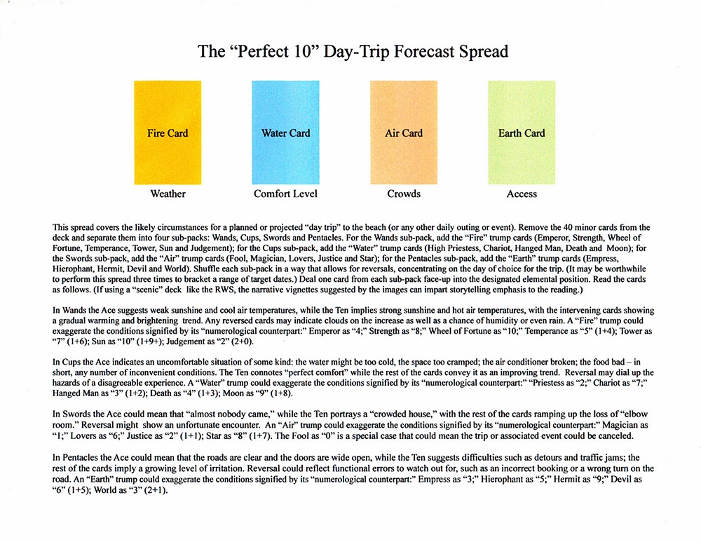 While at a Maine beach yesterday I was thinking about how the tarot might be used for planning any kind of daily outing or event, covering circumstances such as weather, general comfort level, crowds and access (meaning “getting there and getting in”). It applies the 40 “elemental” minor cards and the astrological correspondences for the trump cards; the court cards aren’t used. Reversals suggest any “upset” conditions that might occur in each area. I’ve done this type of spread before but only focused on weather. This one presents the whole picture. It invokes the Pythagorean and Platonic assumption that Ten is the “perfect number.”