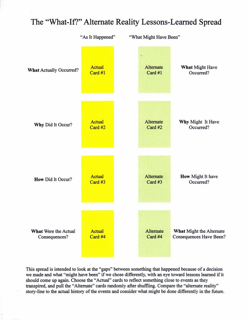 It became obvious that some kind of parallel-path array showing the “actual” and “alternate” realities would be a good way to go. Here is what I came up with. This spread requires intentionally selecting the cards that represent as close an approximation as possible to the actual circumstances (a little creative imagination may be needed in the choice of cards), and then pulling the “alternate reality” cards at random. The reading involves looking for “gaps” between the two that ideally show theoretical opportunities for improvement if the situation ever arises again. Consider it the opposite of a “branching-future” outlook in that it is intended to show a hypothetical “branching past,” all but one branch of which failed to “leaf out.” In that sense, you can add as many “alternate path” columns to it as you like, and could even develop a series of small fictional vignettes if you’re so inclined. Bring the same assumptions and “suspension of disbelief” to it as you would to an “alternate-history” novel or a role-playing game.