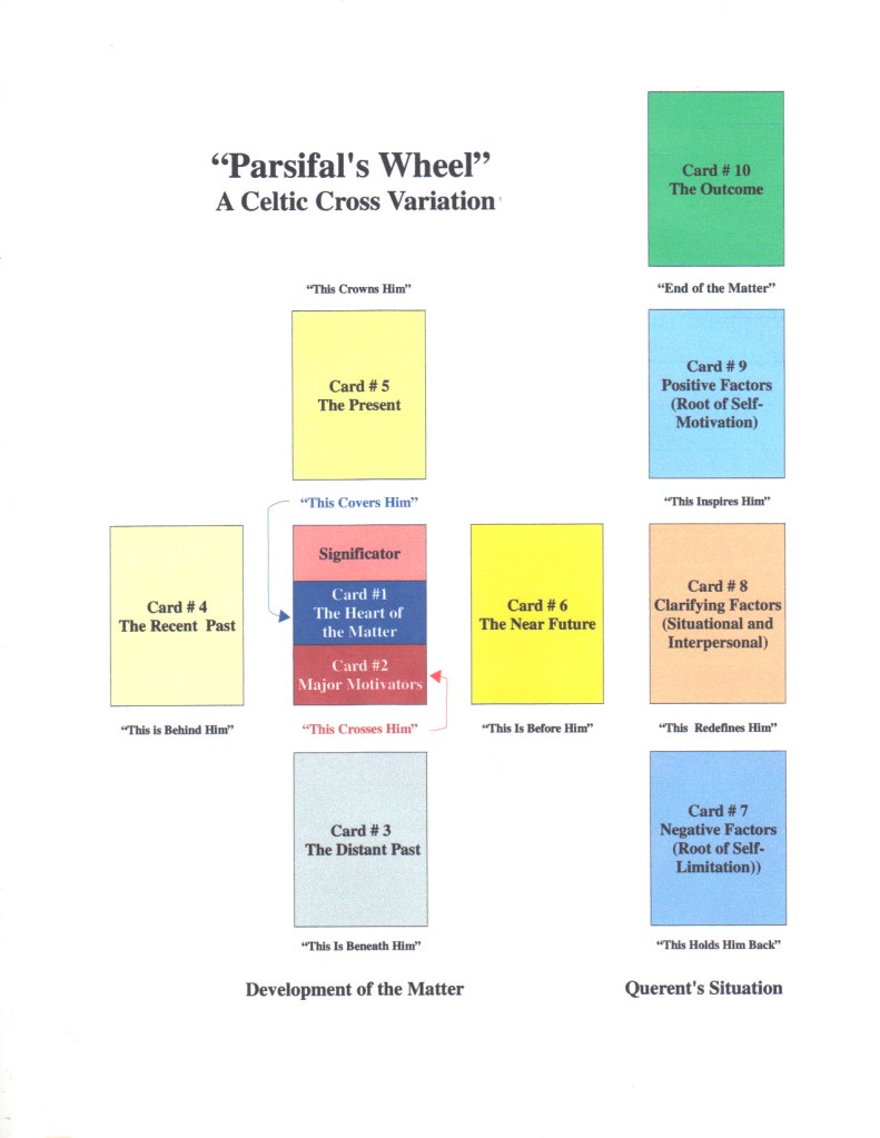 That’s all I can think of that distinguishes my Celtic Cross from the traditional version. I hope it has given you some food for thought. For your information and use, here is my personal layout without the three pages of explanatory text that are summarized above.