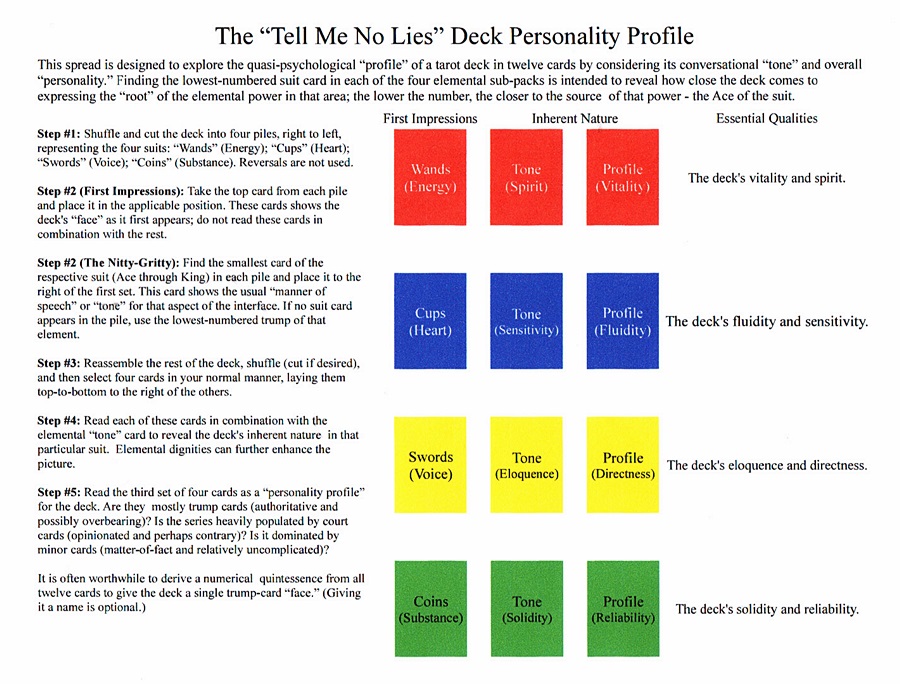 The right-hand column offers a one-card “snapshot” of the deck’s character in four areas, from top-to-bottom: Vitality; Fluidity; Directness and Reliability. The “Vitality” position displays the Queen of Pentacles; of all the Queens, this one is an “ace” at carefully nurturing her stamina and conserving her energy with a steady hand and a practiced eye. I expect the deck will be thrifty and precise in parceling out its shrewdness, with no false starts or wasted motion. However, I may have to “give it a swift kick” to shake loose its pearls of wisdom.