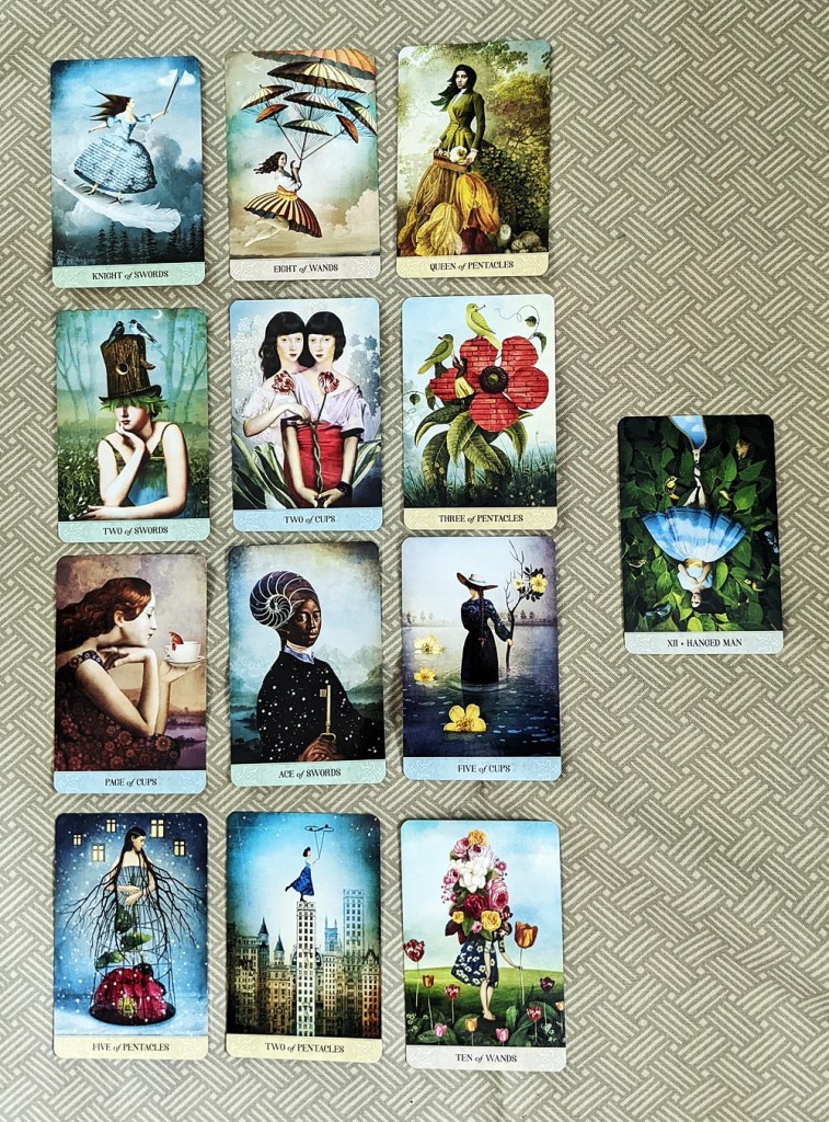 Rather than doing a typical “deck interview” that presents questions to the deck and receives answers from the cards pulled, I use what I call a “personality profile” approach that creates a quasi-psychological overview of the deck and considers “first impressions,” conversational “tone” and composite “disposition” in a twelve-card layout. The spread is largely based on the elemental qualities of each suit. Here are the cards drawn; the spread itself is included at the bottom of the essay. I find it remarkable that, other than the “quintessence” card (always a trump), there isn’t a single Major Arcanum in the spread; this makes me think it will be eminently approachable and won’t go all esoterically “high-brow” on me. I like what I see so far.