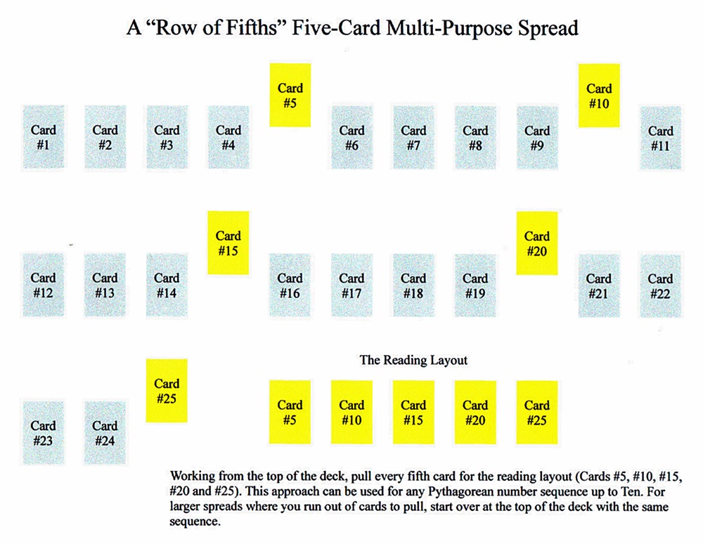 Here’s another “new-to-me” idea, courtesy of The Grand Etteilla. In the book there is a five-card spread in which the reader creates the layout by initially pulling the fifth card from the top (Card #5), then the card five tiers below that one (Card #10), followed by the card five tiers below the tenth card (Card #15), and so on until Card #25 completes the row (see the diagram below). This “row of fifths” offers abundant justification for creating a portfolio of unique spreads based on the Pythagorean number sequence of One through Ten. A series of “Ones” would be identical to the traditional practice of drawing all the cards as an unbroken set from the top of the deck. At the other extreme, a “Ten” series would begin with the tenth card down from the top and proceed by “splits” of 10, delving fifty tiers deep into the pack before concluding. For larger spreads that run out of cards before the last pull, the reader can start over from the top of the deck using the same sequence as many times as necessary to populate the positions. In all scenarios but the “One,” this approach allows a wider range of cards to make an appearance than would normally be the case while being less indiscriminate than randomly selecting cards from a “fan.” (As I’ve said before, the goal of the draw isn’t to dissociate the cards by dispersing them, but rather to bind them into an orderly narrative congruity. The “heavy lifting” has already been done by the shuffle and I don’t want to work too hard recapturing the sense of it.)
