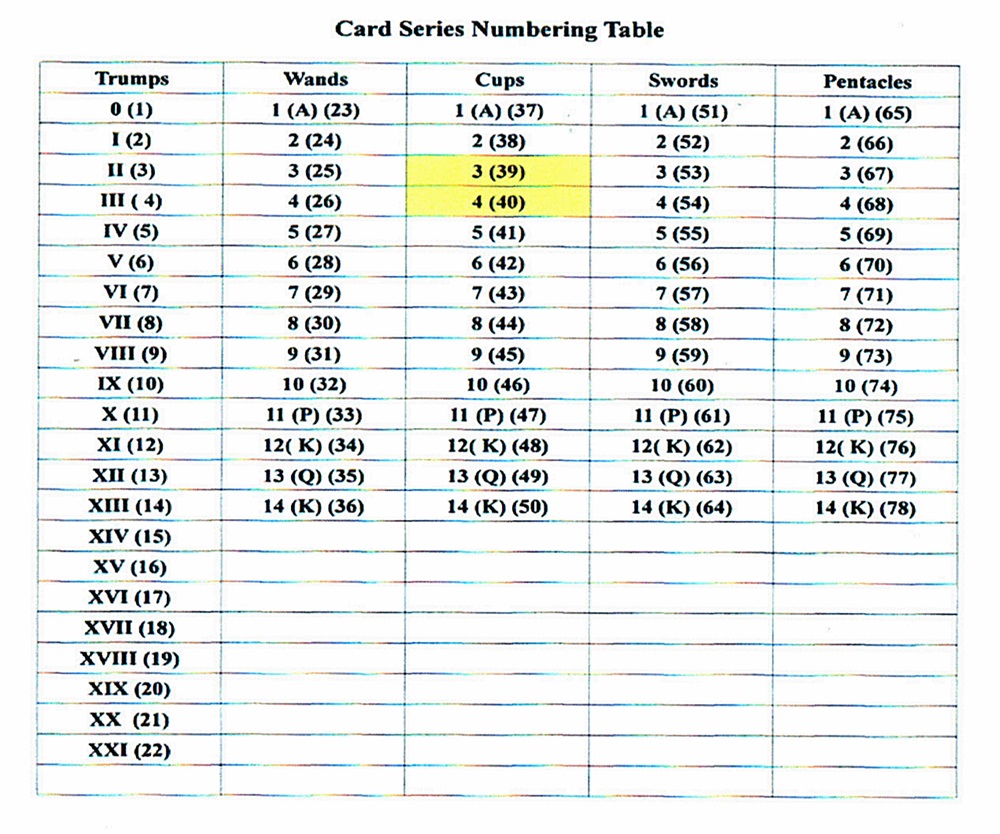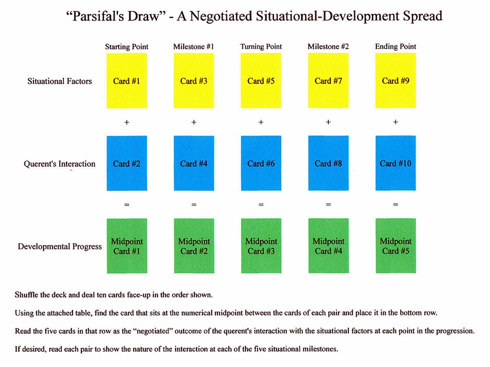 I came up with the idea of breaking these often-merged factors into discrete rows of cards that can then be examined with an eye to their individual and combined contribution to the “Hegelian” model. I’ve named it the “Parsifal’s Draw.” It uses the numerical midpoint between two randomly-drawn cards in each of five sets to provide a “negotiated” outcome card for the interaction of the querent with the situation at each milestone in the progression.