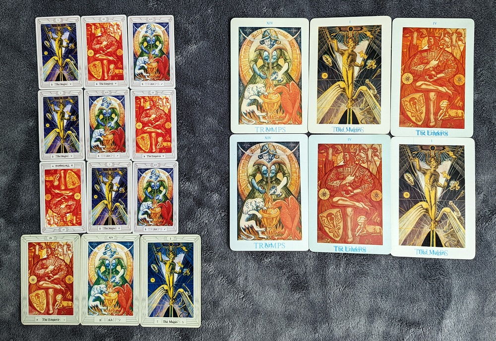 Here are all of the ways in which the example series can manifest, using six Thoth decks rather than the TdM simply because I have enough of them to populate the whole layout. In general, the androgyne in Art is going about its work of orchestrating change oblivious to the regard of the Magus and the Emperor, while in two cases both of the latter are intent upon the operation; in two others they are both looking away; and in the last two instances one is paying attention while the other is disinterested. (There is an error in the third line of the photo, where the Emperor is accidentally reversed and should be looking to the left.) These variables reflect the type of cooperation the ongoing “alchemy of transmutation” shown by Art can expect to receive from its alternately incisive and methodical cohorts. On the other hand, if this were a business or professional matter, I would look to the condition of the Emperor, and if a conceptual or innovative one I would first check the status of the Magus. If the nature of the main “quint” does not plausibly invoke the essence of the topic or question, it may be worthwhile to read the card on the far left as being “in the driver’s seat,” or to specifically choose one of the other two better suited to that purpose. Use of reversals could alter the “gaze” of the three cards in one direction or the other.