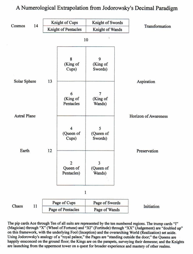 Despite published opinion to the contrary (e.g. Hajo Banzhaf), I have long held that the court cards must be informally numbered 11 through 14 in order to perform a “quintessence” calculation that properly includes all of the cards in a spread, so I decided to see if Jodorowsky’s premise can be made to accommodate the inclusion of those cards in a way that isn’t jarringly unnatural. I used his analogy of a court-card “palace” to align them with his ascending ten-point structure for the pip and trump cards. I also added a little cosmology of the sort that he vehemently derides as the “useless mutilations” of syncretism because it pleases me to do so and it agrees with my esoteric worldview. Furthermore, although Jodorowsky feels that the court cards cannot be encompassed by his decimal model of the tarot universe, he does manage to shoehorn 22 trump cards into this mathematical framework with a little creative pruning; we might therefore say he’s talking out of both sides of his mouth.