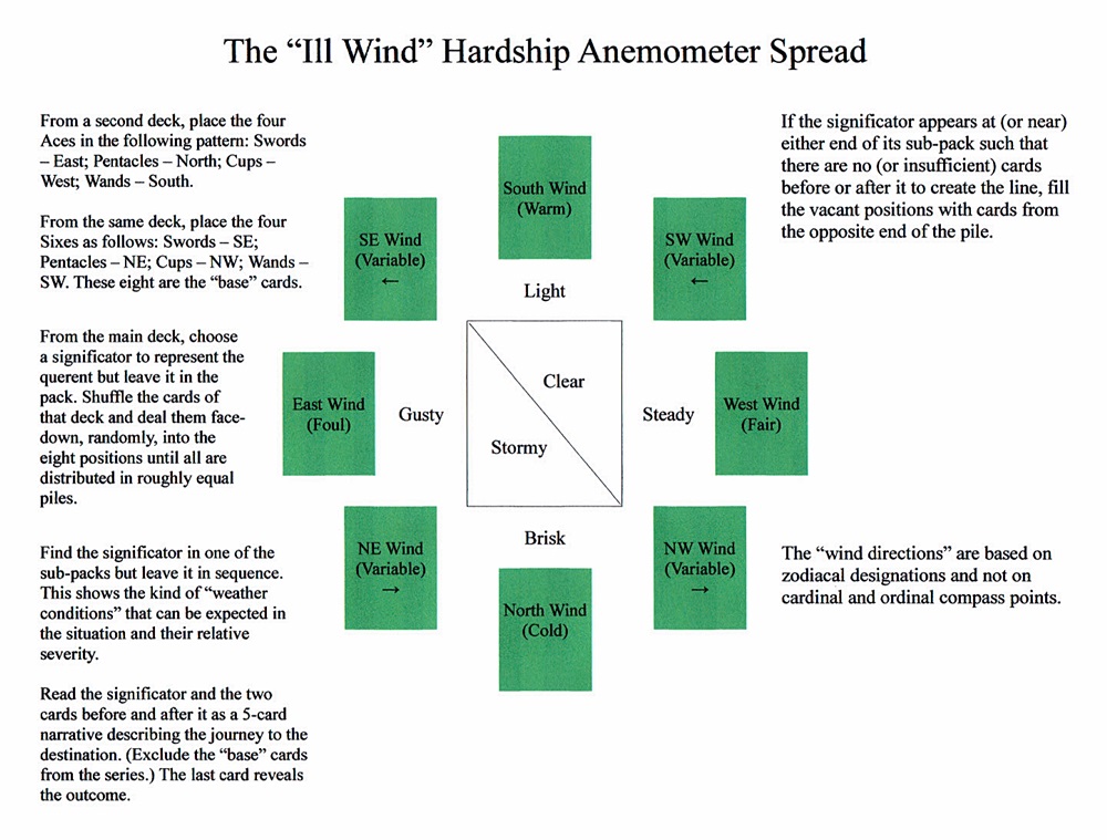 The idea is to select a significator in advance to represent the querent, then shuffle and deal the deck to see which of eight “weather systems” the significator appears in; the three easternmost zones could be unpleasant for the querent, while the three to the far West should be much more agreeable, and the North and South extremes suggest either bracing or balmy “stationary fronts.” This leads to a five-card reading that shows how uneventful or, alternately, how uncomfortable the querent’s travels through the exigencies of the matter will be and the outcome that is likely to emerge.