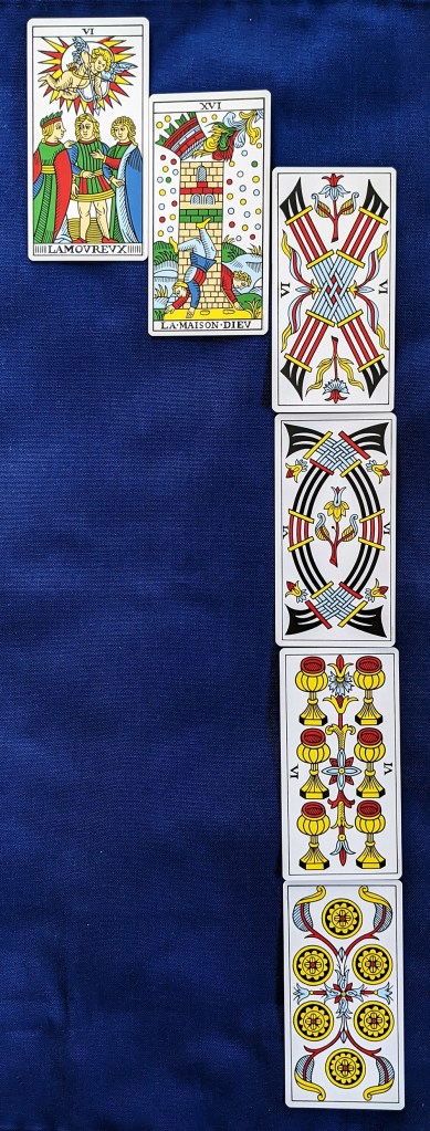 Beyond being merely an intellectual exercise, this way of linking the cards in a reading can provide unexpected fodder for narrative amplification, as it does here. The visual array below tells the story. Perhaps the amorous gentleman in the Lovers makes a bad choice in spite of Divine intervention and the Tower shows what becomes of his decision; it basically says “I told you so!” The Sixes tumbling down the right side suggest having to let go of everything he holds dear: respect, peace of mind, pleasure and prosperity. Only the lawyers make out in the end.