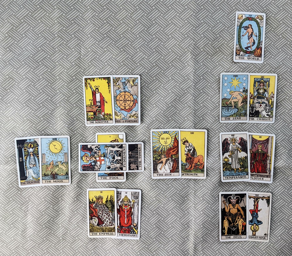 The Fool in the first position (“Beginning of the Matter”) and the World in the last position (“End of the Matter”) seemed obvious. Because the Fool represents “inception” and the World depicts “completion,” I decided to place them singly in those positions as the “Alpha and Omega” of the reading template.