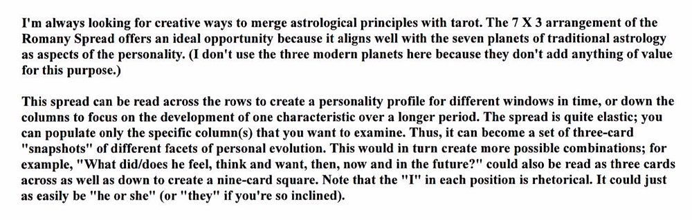 I finally got around to breaking out my new Etteilla I deck for a trial run. Since Alliette’s spreads for use with the deck tend to be highly complex, I decided to use my self-created “astrological” version of the 21-card Romany spread for this reading (which echoes Alliette’s affection for multiples of “7”). The question involved a person who is nearing a crossroads in career and in life. The spread delivers a “personality profile” from past, present and future perspectives. It provides for Alliette’s assumption that the influence of a card above “falls into” the card(s) below, in that the Past cascades into the Present, which in turn feeds the Future. I used reversals since the Etteilla cards have double-ended keywords, one for upright and one for reversed; however, reversal in this system merely furnishes alternative (and not always particularly congruent) meanings; it doesn’t seem to have any other divinitory significance.