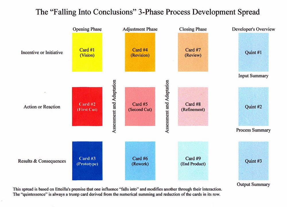 Here’s some more fallout from my study of Etteilla; in his reading examples he talks about one card in a spread “falling into” another, and the meaning of both being modified by their interaction. This spread looks suspiciously like “Production Management 101,” but I can see it being used for complex personal or group projects.