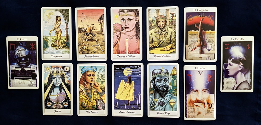 I performed this Thanksgiving Day NFL prediction using my “Enemy at the Gates Vulnerability Spread” (see link below) with the Cosmic Tarot for the main pull and the Rohrig Tarot (Spanish Edition) for the supplemental cards. As always for a sports forecast, I chose the Chariot as the “Opportunity” card describing what the confrontation is about: in this case it’s “Triumph.” As the home team, the Lions take the top row of the spread and the Bills have the bottom row.