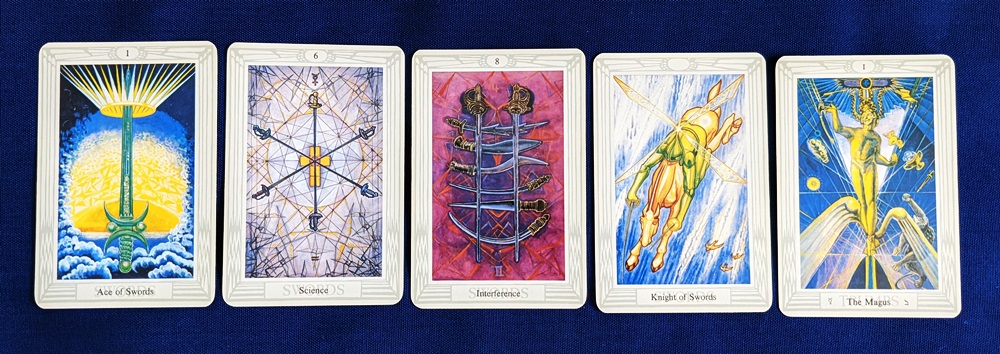 I recently performed a reading for someone who is facing surgery and wanted to know what post-operative circumstances would be like. (This is not a medical scenario involving the diagnosis of illness or the proposal of remedies so there are no immediate ethical concerns.) I used the Celtic Cross spread with reversals. I won’t go into the details of the reading other than to say that the conclusion was “Science will win out in the end,” but three of the five cards shown below appeared in the layout. This got me thinking about the cards of the tarot that can suggest surgical procedures when they appear in a reading about well-being (Lenormand has its “Scythe” so I assumed that there are tarot cards to mirror that premise).