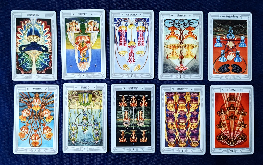AUTHOR’S NOTE: There is a wonderful metaphor that speaks directly to our attitude about life’s occasional downturns and hints at whether we are naturally optimistic or pessimistic in our outlook: “Is the glass half full or half empty?” As a lifelong skeptic, my first thought when confronted with this conundrum is “What’s in the glass?” before I decide how to react to its status. But I’m not here to talk about me (this time, anyway), I want to discuss the reversed suit of Cups and a few other cards that partake of the element of Water or its esoteric equivalent, Spirit. (All images are from the Thoth Tarot, copyrighted by U.S. Games Systems, Inc, Stamford, CT.)