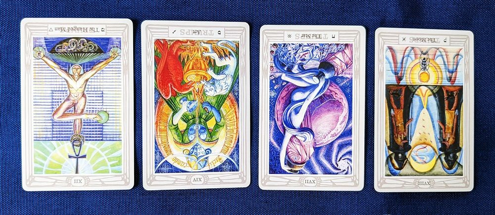 The cards of the Major Arcana that come under this “water-management” model are an interesting bunch. These are not all of the “watery” trumps but they are the ones that best exemplify the premise I’m chasing here, while the non-Water trumps have a definite “fluidity” about them. I intentionally left out the Chariot (Cancer), Death (Scorpio) and the Priestess (Moon) because they don’t quite take me where I wanted to go with this (respectively, they are more decisive, reductive and retentive by nature).
