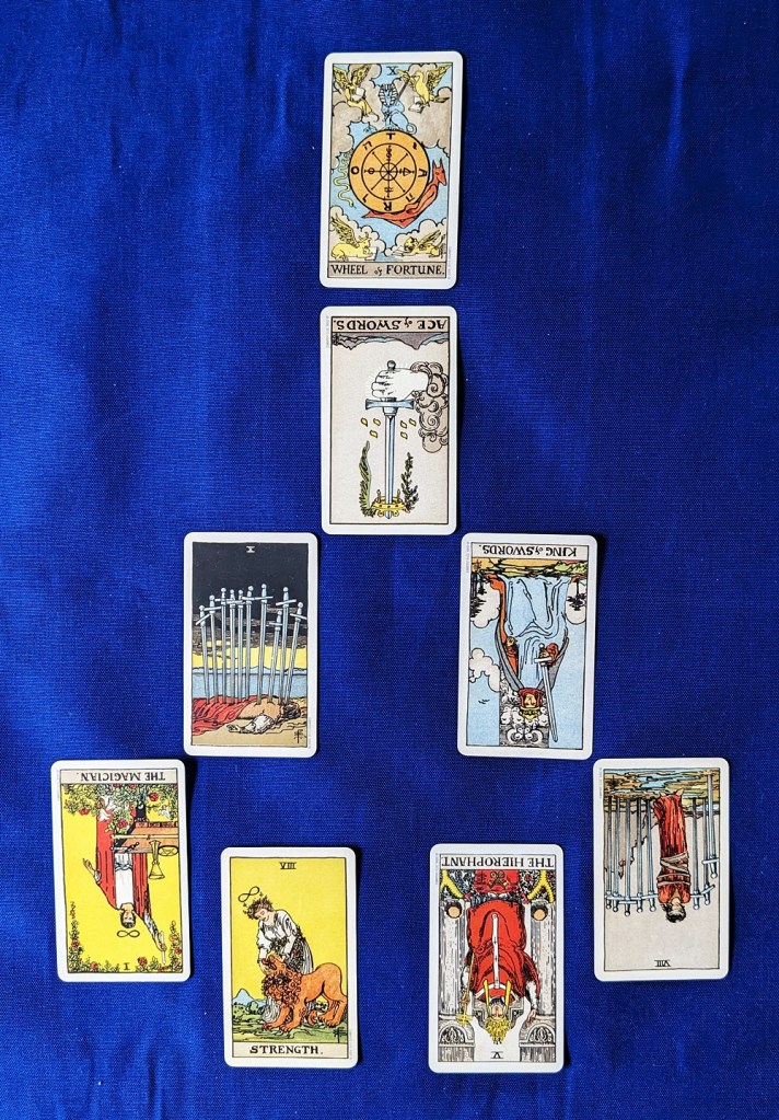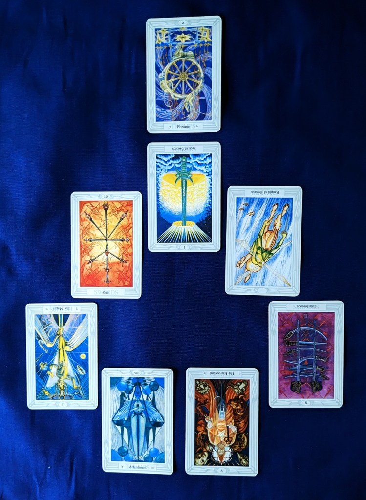 For the “Subject” card I selected the Wheel of Fortune since this decision-making evolution entails “spinning the wheel of destiny.” I first pulled the spread using the Thoth deck, but after examining it I decided that the Waite-Smith tarot would provide a clearer perspective on the situation so I substituted those cards for the Thoth pull. This necessitated changing out one of the “quintessence” cards due to the alternate numerical correspondences for the Adjustment/Justice and Lust/Strength cards. Immediately below is the RWS version; the Thoth layout follows the interpretation, which is based on the RWS imagery.